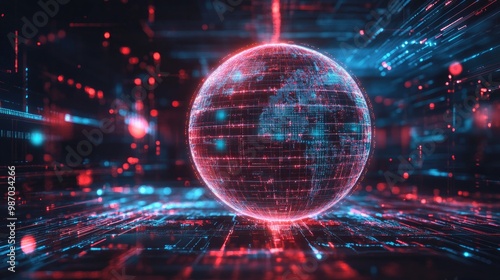 A glowing holographic globe shielded by firewalls and secure data channels, representing information security worldwide.