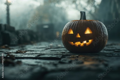 A glowing jack-o'-lantern sits on a cobblestone path, surrounded by a misty atmosphere, evoking a spooky Halloween vibe.