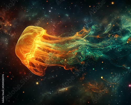 A glowing jellyfish floats in a cosmic environment, surrounded by vibrant colors and swirling gases, blending elements of the ocean and space to create an abstract representation.