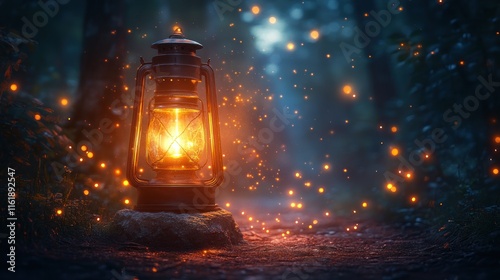 A glowing lantern illuminates a serene forest path, surrounded by sparkling particles.