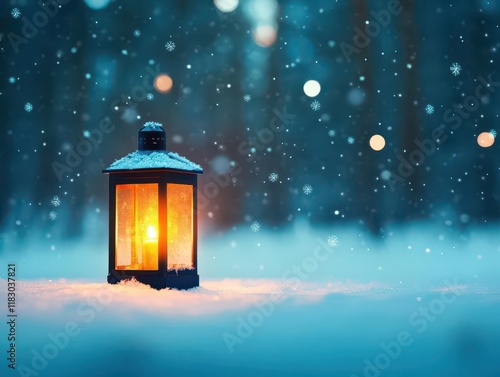A glowing lantern swaying gently in a snowy forest, snowflakes falling softly, bright ambiance, eye-level shot