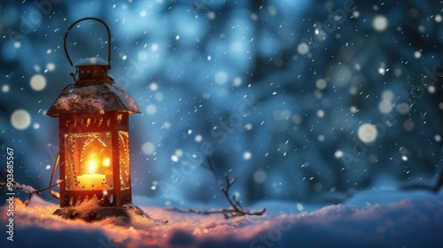 A glowing lantern with a candle inside, placed in a snowy landscape at night, creating a warm and cozy atmosphere.