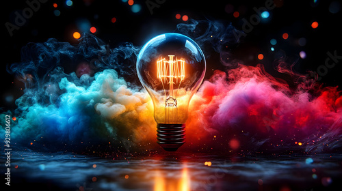 A glowing light bulb amidst colorful smoke and sparkles.
