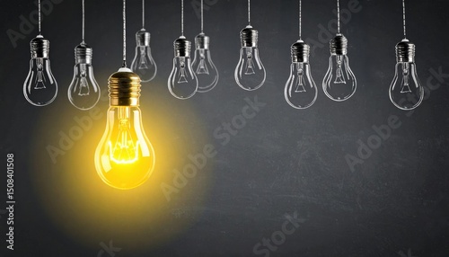 A glowing light bulb among dim ones hanging in a row symbolizing innovation, breakthrough idea, leadership or the concept of thinking differently