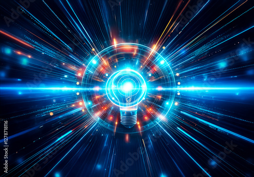 A glowing light bulb at the center of radiating blue and orange energy lines and circles, symbolizing innovation and bright ideas in a tech-focused environment.