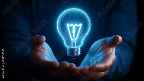 A glowing light bulb held in hands, symbolizing innovation, creativity, and bright ideas for the future.