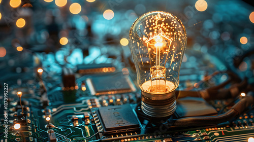 A Glowing Light Bulb Resting on a Circuit Board Amidst Soft, Bright Illumination, Showcasing the Fusion of Technology and Innovation in a Tech-Inspired Setting