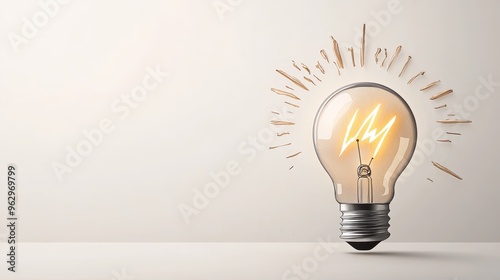 A glowing light bulb with rays of light, symbolizing ideas, creativity, and innovation on a neutral background.