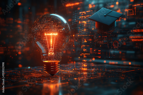 A glowing lightbulb intertwined with a graduation cap icon, surrounded by digital network lines and symbols, symbolizing innovative e-learning concepts