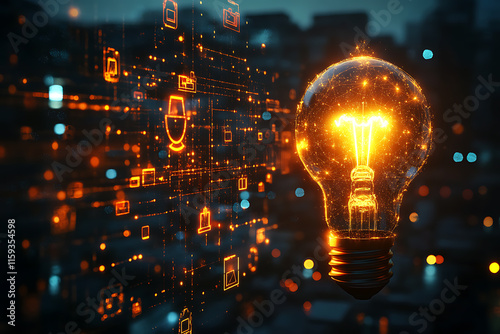 A glowing lightbulb intertwined with a graduation cap icon, surrounded by digital network lines and symbols, symbolizing innovative e-learning concepts
