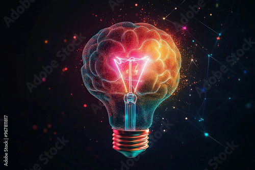 A glowing lightbulb made of swirling neon colors, floating above a geometric brain, symbolizing innovation and new ideas on a sleek black backdrop.