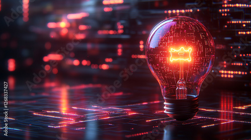 A glowing lightbulb with a circuit board filament emits energy, symbolizing innovation and technological advancement, set against a dark backdrop of digital streams, conveying modernity and progress.