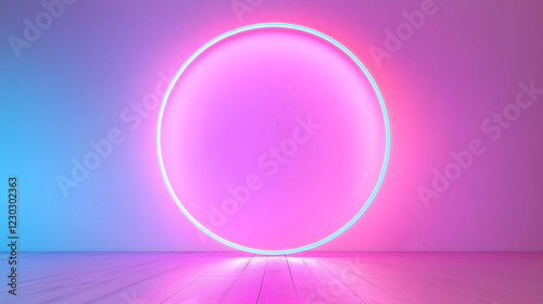 A glowing neon circle with pink and blue hues on a sleek wooden floor. A futuristic, minimalistic background ideal for branding or creative design.