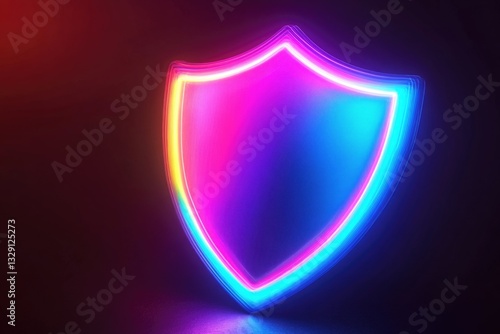 A glowing neon shield symbolizing protection and safety, with vivid colors in a dark room. Abstract digital design.