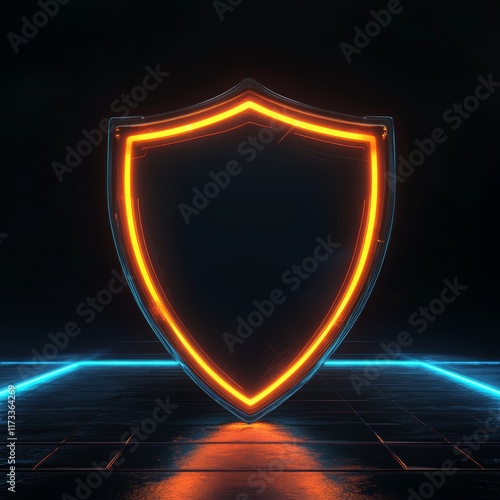 A glowing neon shield with an orange outline on a dark background, symbolizing digital security and futuristic technology.