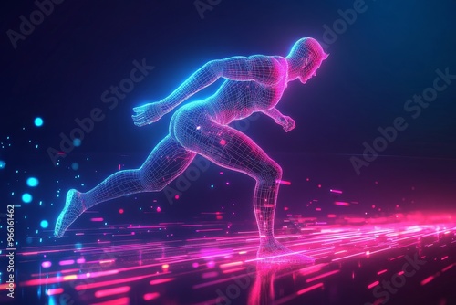 A glowing neon wireframe runner strides forward over a pink and blue digital track.