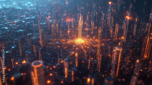 A glowing neural AI network extending across a futuristic city, symbolizing intelligent communication between machines and humans