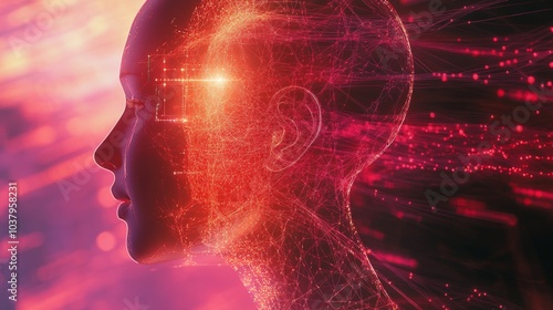 A glowing neural network diagram overlaying a human head silhouette, representing human-AI interaction.