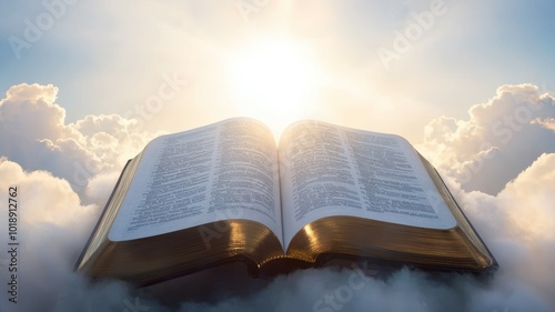 A glowing open book shines brightly as sunlight breaks through the clouds during a serene morning setting