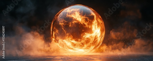 A glowing orb of energy illuminating a misty, dark surface, with vibrant lights and celestial sparks, resembling a powerful cosmic force