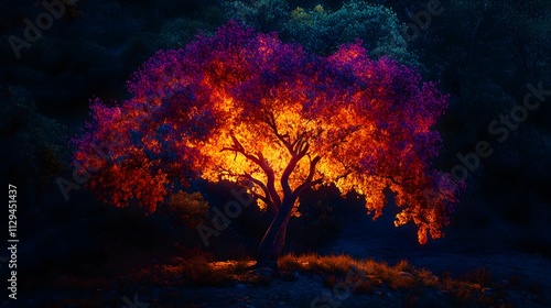 A glowing phoenix tree ablaze with vibrant colors in a dark enchanted forest.