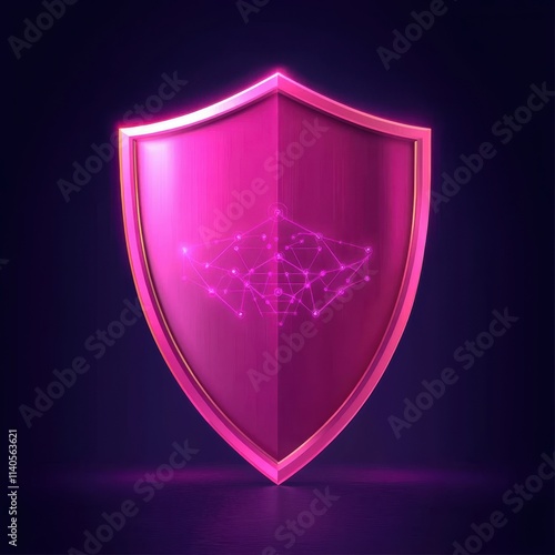A glowing pink shield with a digital network design, representing protection and technology in a modern setting.