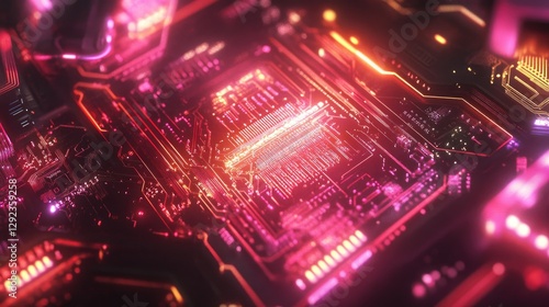 A glowing production floor where AI-controlled robotic arms are assembling sophisticated electronic boards.