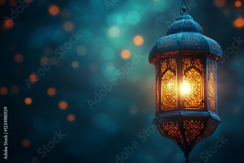 A Glowing Ramadan Lantern Hangs Against A Softly Blurred Teal Background, Creating A Peaceful And Spiritual Mood.