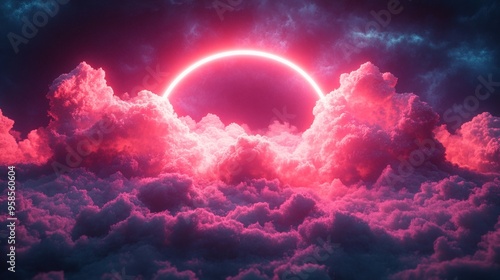 A glowing red ring hovers above a sea of pink clouds, creating a surreal and ethereal landscape.