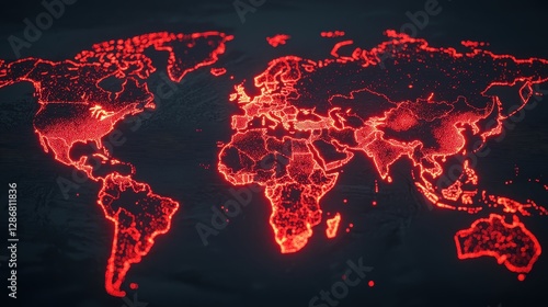 A glowing red world map on a dark background, highlighting continents and countries in a futuristic design.