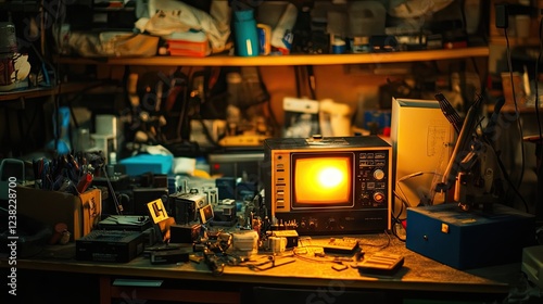 A glowing shortwave radio on a cluttered workbench filled with old electronics