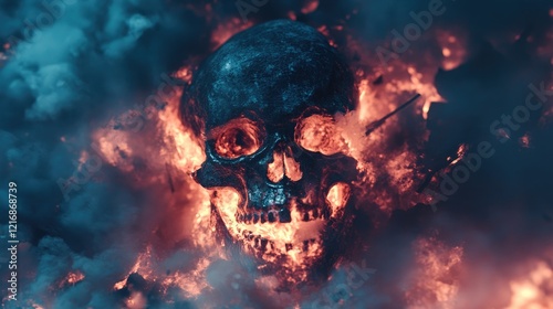 A glowing skull emerges from fiery clouds, creating a dramatic and intense atmosphere.