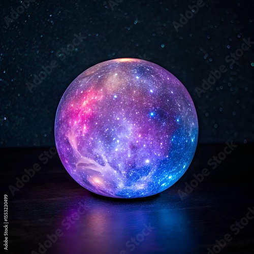 A glowing sphere encapsulates a starry universe, reflecting vibrant colors on a dark surface.