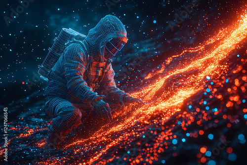 A glowing wireframe illustration of a geologist in a protective suit studying an active volcano with advanced scanning equipment, analyzing lava flows and seismic data.