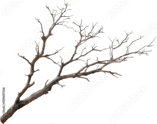 A gnarled dead tree branch with intricate twig details isolated on transparent background