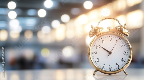A gold alarm clock sits on a table, the time is nearly one o'clock, with a blurred background of soft lights and shapes suggesting an office or waiting area. : Generative AI