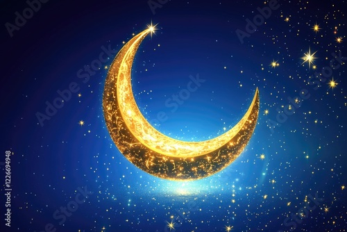 A gold crescent moon with stars surrounding it. The moon is lit up and the stars are twinkling. The image has a dreamy and peaceful mood