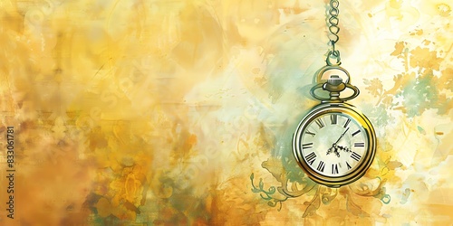 A gold pocket watch hangs from a chain against a textured background in shades of yellow and gold.