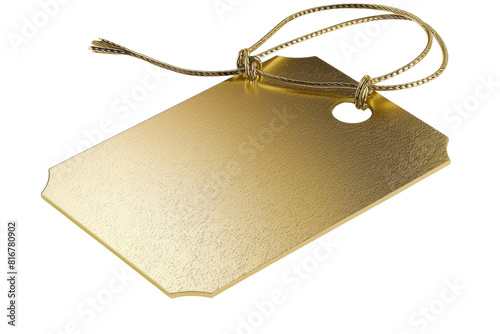 A gold tag with a string hanging from it. The tag is rectangular and has a hole in the center