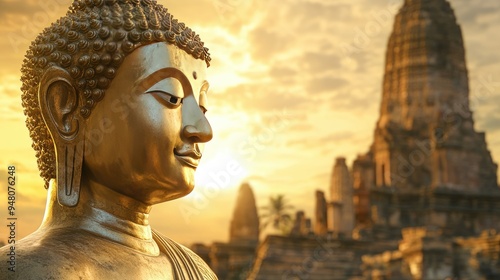 A golden Buddha statue set against a backdrop of ancient temple ruins, blending spirituality with historical charm