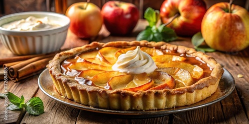 A golden crust apple tart with a swirl of whipped cream, ready to be enjoyed