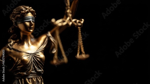 A golden figure representing justice, blindfolded, holds balanced scales in one hand against a dark backdrop, embodying fairness and equality in law. The figure symbolizes legal ideals