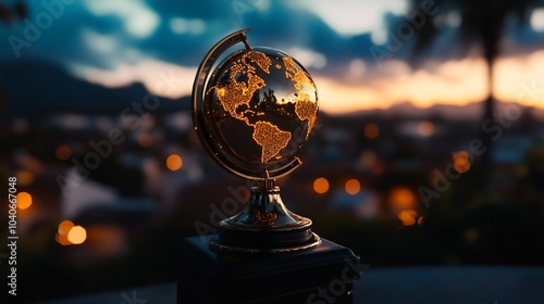 A golden globe sits atop a wooden base with a sunset and city lights in the background.