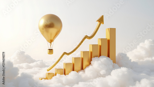 A golden hot air balloon rises above a chart showing upward growth, symbolizing success and aspiration amidst fluffy clouds.