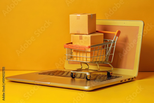 A golden laptop with a shopping cart and boxes symbolizes online shopping and e-commerce trends in a vibrant artistic setting. Generative AI