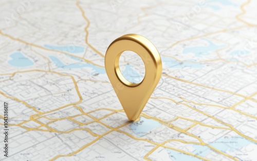 A golden location pin stands out on a detailed city map, symbolizing navigation and location tracking in a modern urban environment.