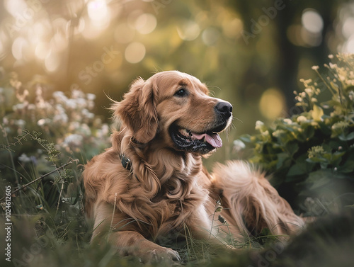a golden retriever dog resting in a forest