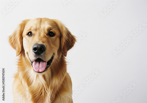 a Golden Retriever from a front-facing angle, positioned on the left side of the image against a pure white background