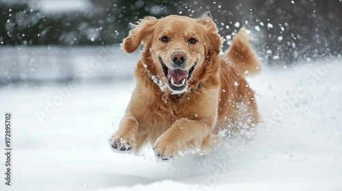 A golden retriever joyfully runs through fresh snow in a winter wonderland, capturing the essence of playfulness and freedom outdoors