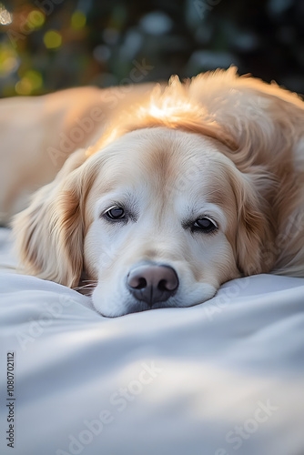 A golden retriever lies with a sad expression, bathed in soft light, symbolizing loyalty and companionship.